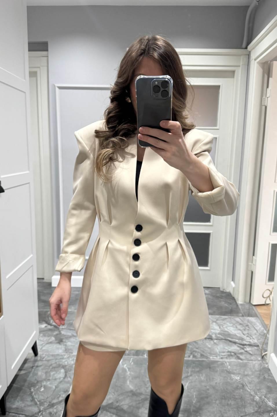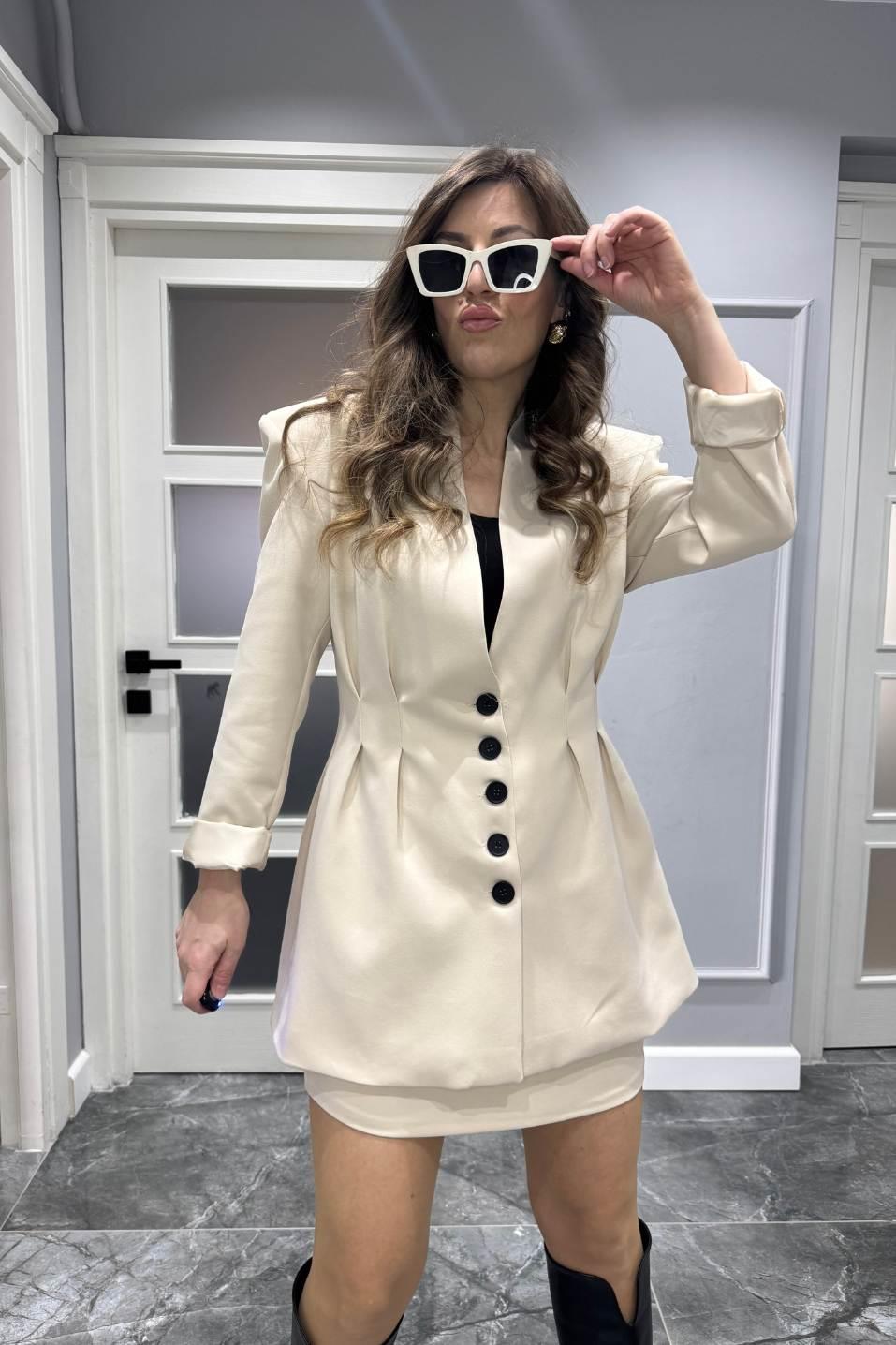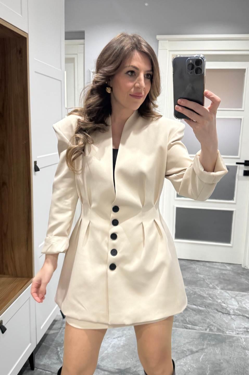 Fresno Belden Oturtmalı Vatkalı Ceket Etek Takım Bej (BA25İDG0003)
