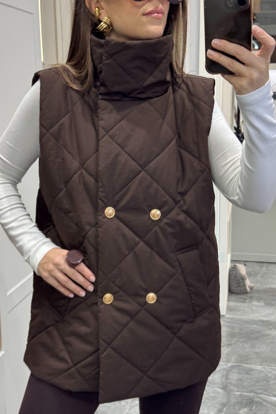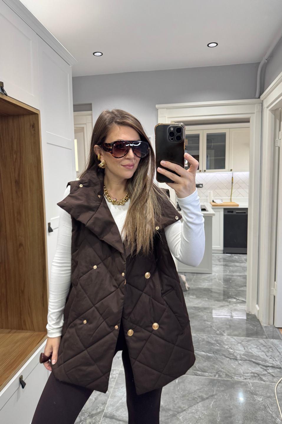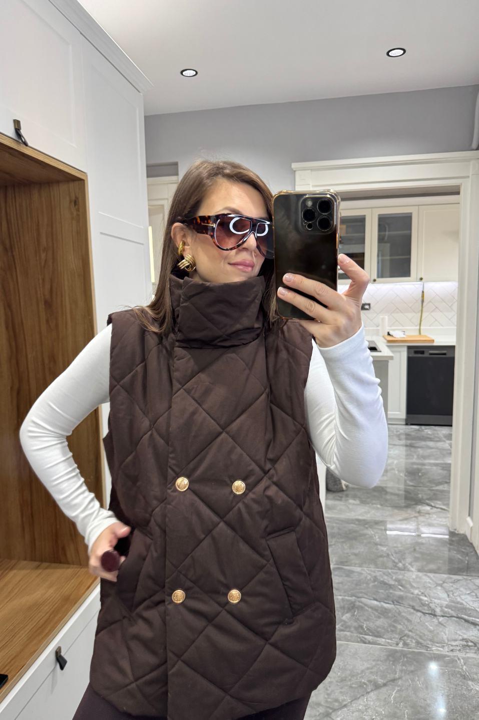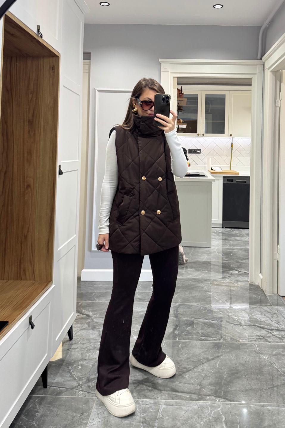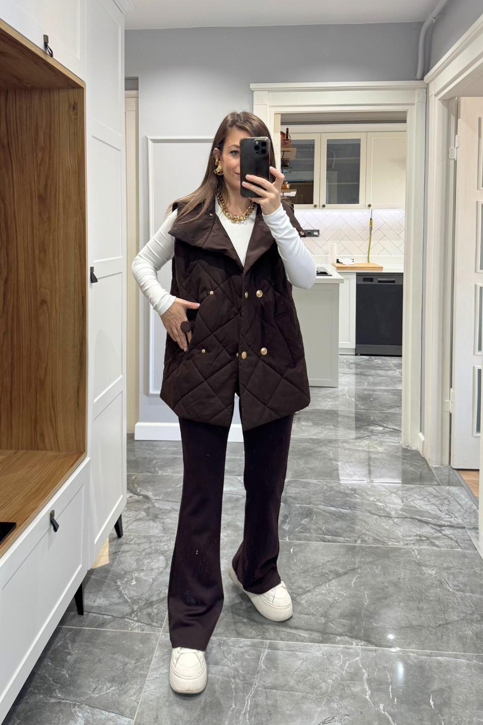 Marguess Kapitone Gold Düğmeli Yelek, Banu Angay’ın yeni sezon kreasyonunda lüks dokunuşu modern çizgilerle buluşturuyor. Baklava desenli kapitone formu, gold düğme detayları ve yüksek yakasıyla soğuk günlerde şıklığı elden bırakmayan bir stil sunar. İçi tam astarlı yapısı sayesinde konforlu bir sıcaklık sağlar. %100 pamuk kumaşıyla hem yumuşak hem nefes alabilen bu model, şehir stilinden hafta sonu kombinlerine kadar her görünüme zarif bir dokunuş katar.