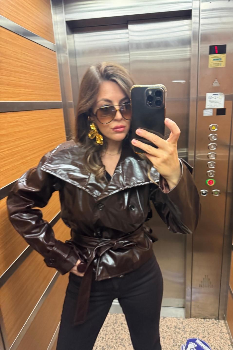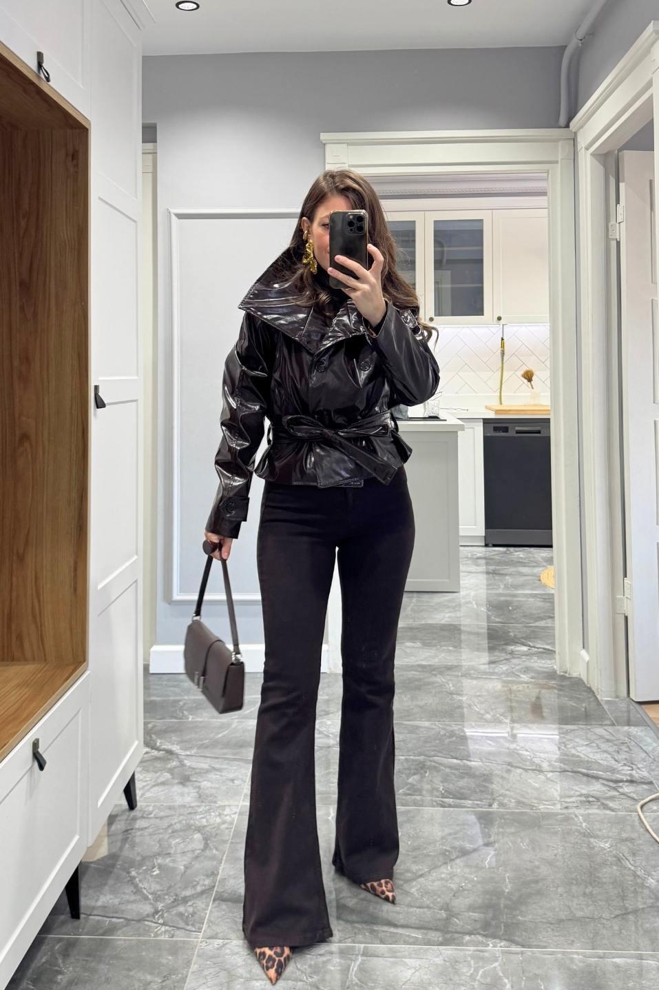 Kuşak detayı ve parlak dokusuyla sezonun en iddialı parçalarından biri. Ünlü markaların muadili kalitede üretilen bu özel parça, cool ve güçlü duruşuyla şehir stilini yeniden tanımlar. Tok deri dokusu ve modern formu ile Banu Angay FW25 Koleksiyonu’nun lüks enerjisini taşır. S, M, L bedenlerde sınırlı sayıda.