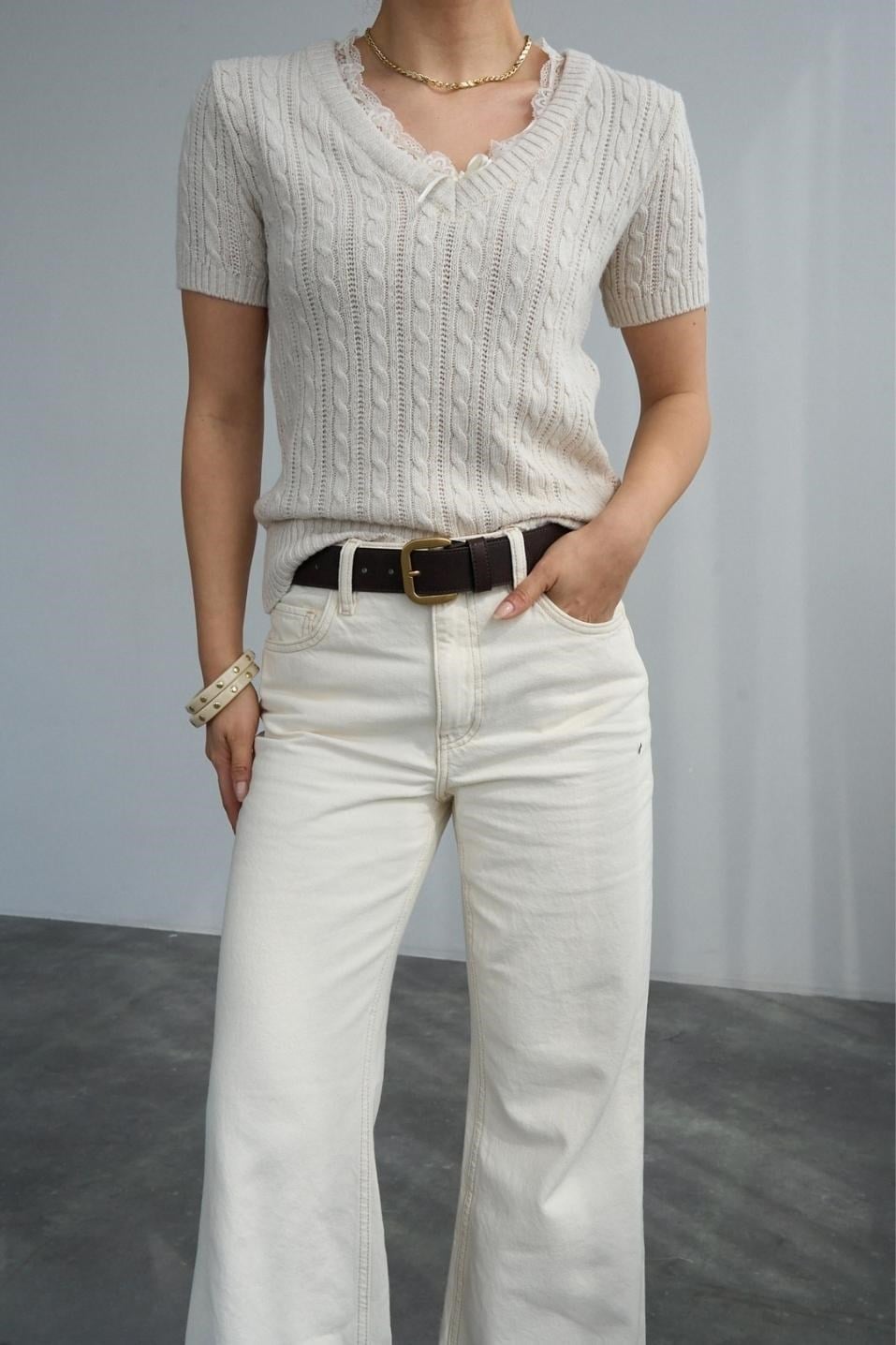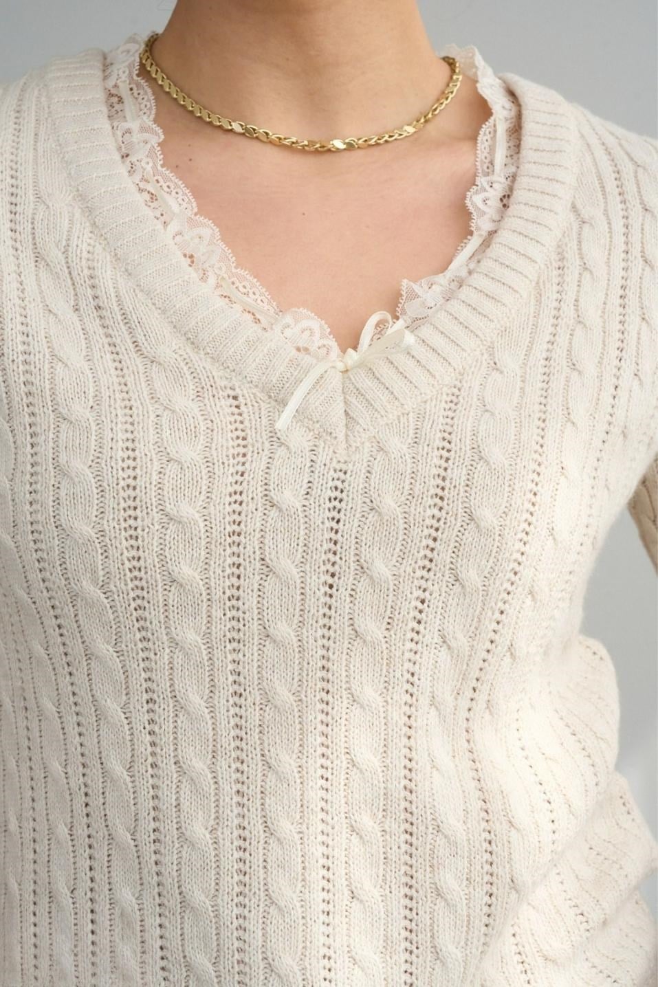 V Yaka Dantelli Triko Bluz Krem (BA26SKUG002)